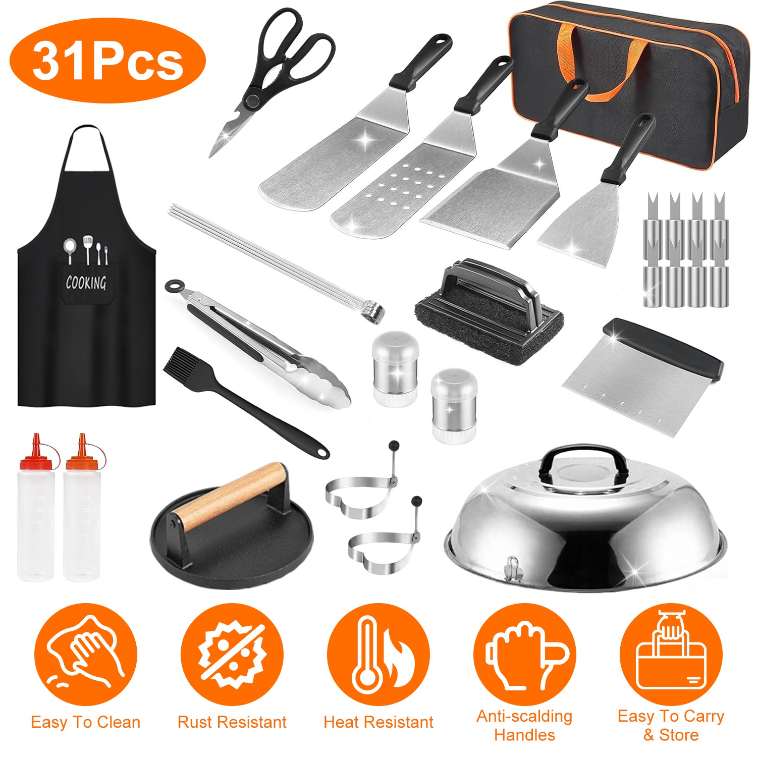 31Pcs Griddle Accessories Kit Flat Top Grill Accessories For Camp Chef with Spatulas Griddle Press Basting Cover Spice Shakers Vegetable Forks Steel S